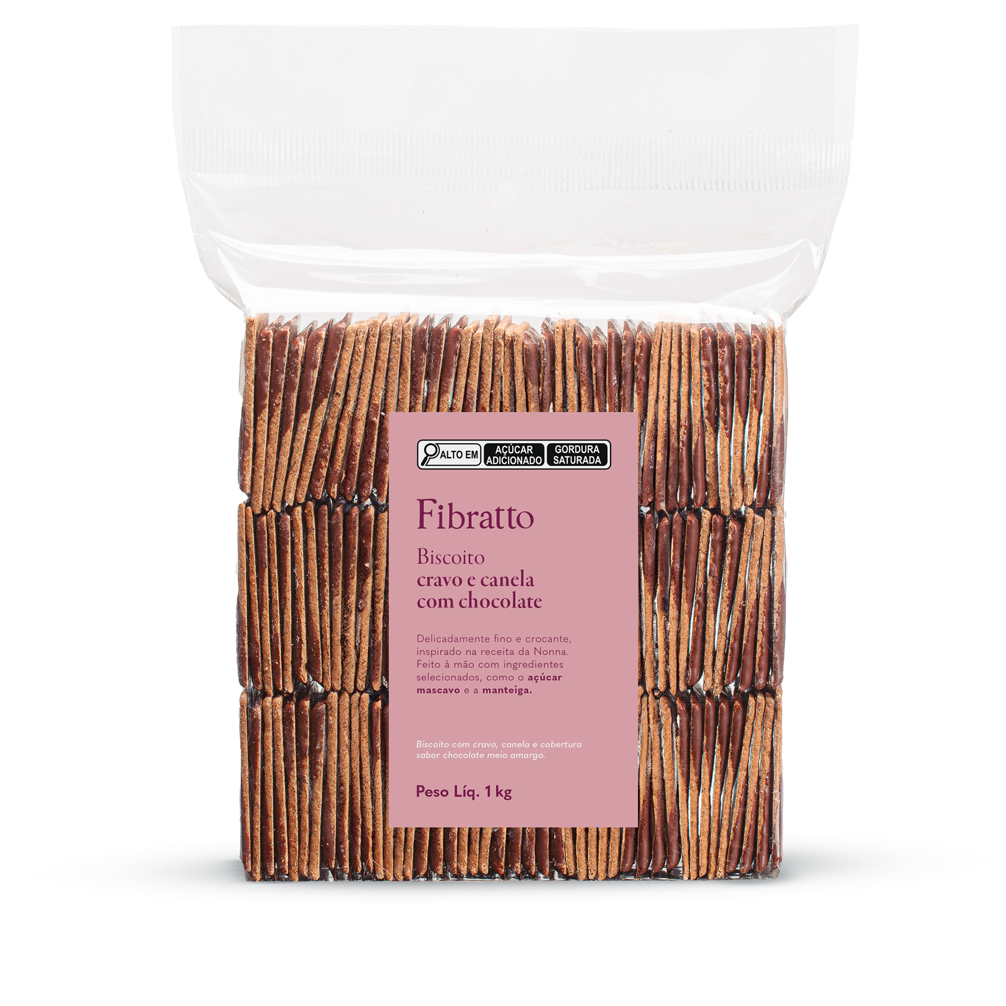 INGREDIENTES: Farinha de trigo enriquecida com ferro e ácido fólico, cobertura sabor chocolate meio amargo (açúcar, gordura vegetal, cacau em pó e leite integral em pó) açúcar mascavo, farinha de trigo integral, manteiga, ovos, canela, fibra de trigo, cravo, fermento químico bicarbonato de sódio e antioxidante extrato natural de alecrim.