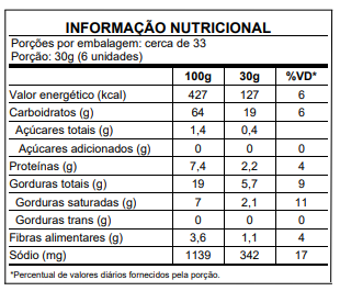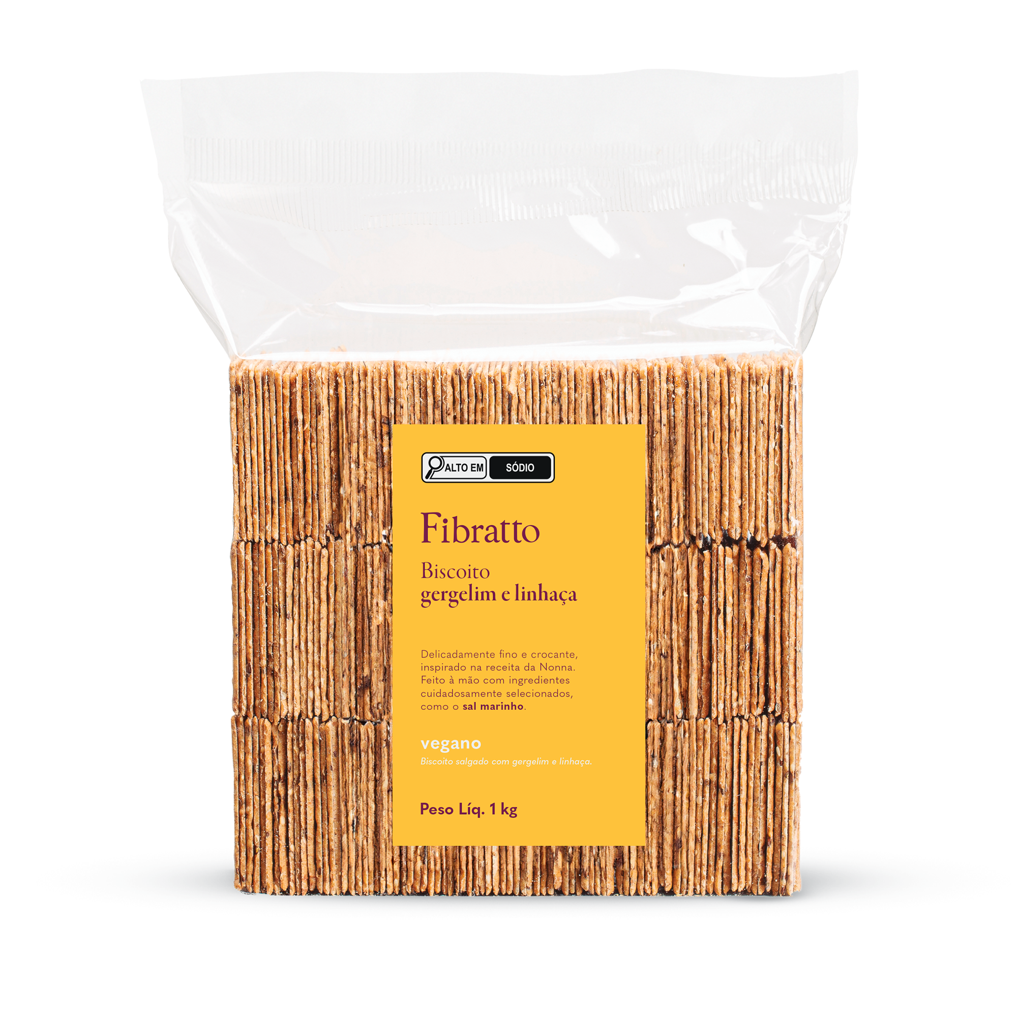 INGREDIENTES: Farinha de trigo enriquecida com ferro e ácido fólico, farinha de trigo integral, gergelim, linhaça marrom, óleo de soja, sal marinho, fibra de trigo, fermento químico bicarbonato de sódio e antioxidante extrato natural de alecrim.