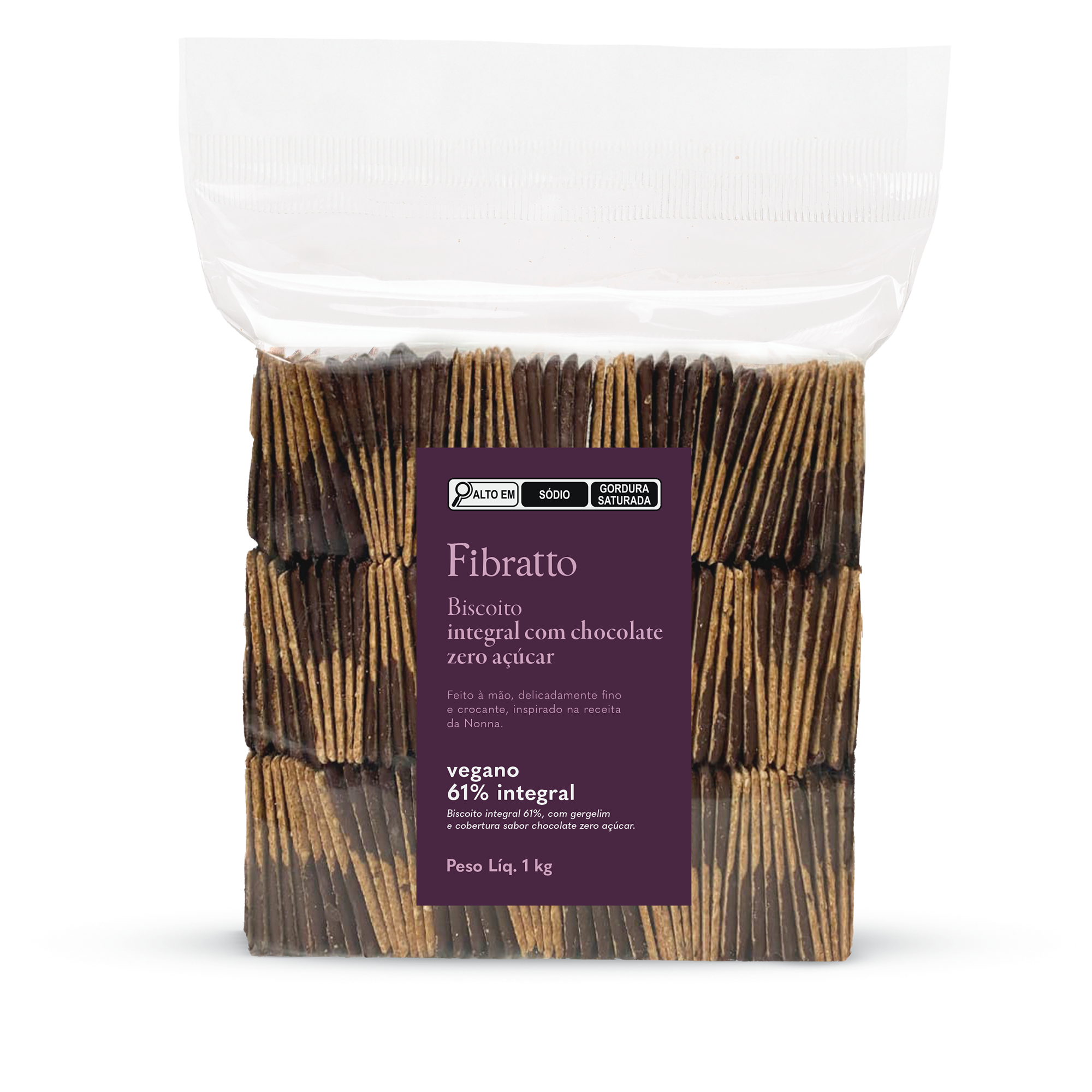 INGREDIENTES: farinha de trigo integral, cobertura sabor chocolate meio amargo baixo em açúcares (gordura de palmiste, cacau em pó, massa de cacau), gergelim, óleo de soja, linhaça marrom, sal marinho, fibra de trigo, fermento químico bicarbonato de sódio, edulcorante maltitol, emulsificantes lecitina de girassol e antioxidante extrato natural de alecrim.