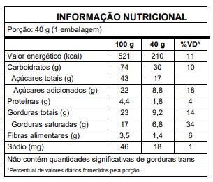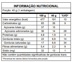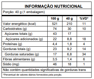 INGREDIENTES: Farinha de arroz, açúcar mascavo, manteiga, polvilho doce, farinha de milho, cacau em pó, fécula de batata, amido de milho, psyllium, café, ovo integral em pó, emulsificante goma xantana, fermento químico, bicarbonato de sódio, e antioxidante extrato natural de alecrim. Cobertura sabor chocolate meio amargo (açúcar, gordura vegetal, cacau em pó, leite integral em pó e emulsificante lecitina de soja).