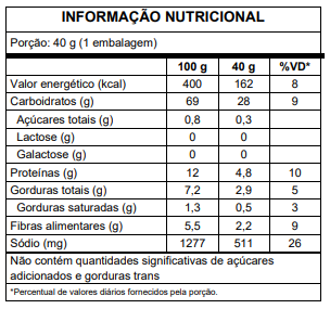 INGREDIENTES: Farinha de trigo enriquecida com ferro e ácido fólico, farinha de trigo integral, óleo de soja, cebola, sal marinho, fibra de trigo, salsa, fermento químico bicarbonato de sódio e antioxidante extrato natural de alecrim