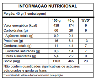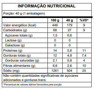 INGREDIENTES: Farinha de trigo enriquecida com ferro e ácido fólico, farinha de trigo integral, gergelim, linhaça marrom, óleo de soja, sal marinho, fibra de trigo, fermento químico bicarbonato de sódio e antioxidante extrato natural de alecrim.