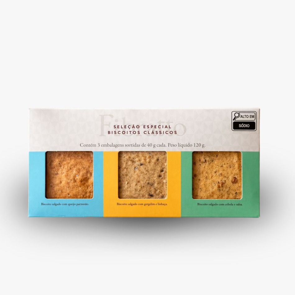 INGREDIENTES: Farinha de trigo enriquecida com ferro e ácido fólico, farinha de trigo integral, queijo parmesão, óleo de soja, sal marinho, fibra de trigo, fermento químico bicarbonato de sódio e antioxidante extrato natural de alecrim.